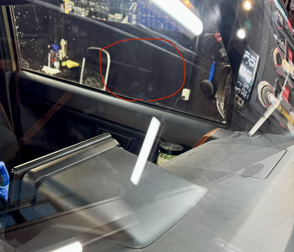 画像の通りでフロントガラス運転席側ワイパー稼働部に傷があり、特に分かりやすい部分を赤丸で囲っています。