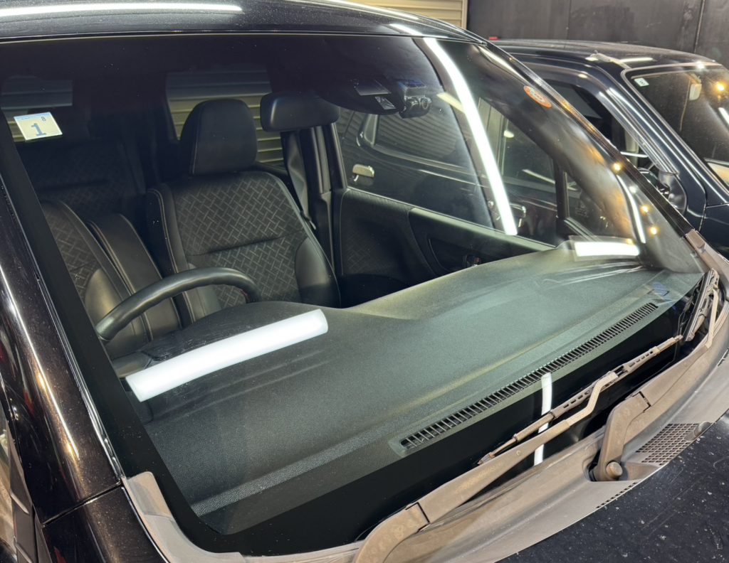 洗浄脱脂後ガラス撥水コーティングを施工していきます。施工後はスッキリとした視界になるとともに撥水が効いていますので雨天時の運転が楽になります。安全快適なドライブのためにぜひおすすめいたします。フロントガラスのワイパー傷消しなども行っております。