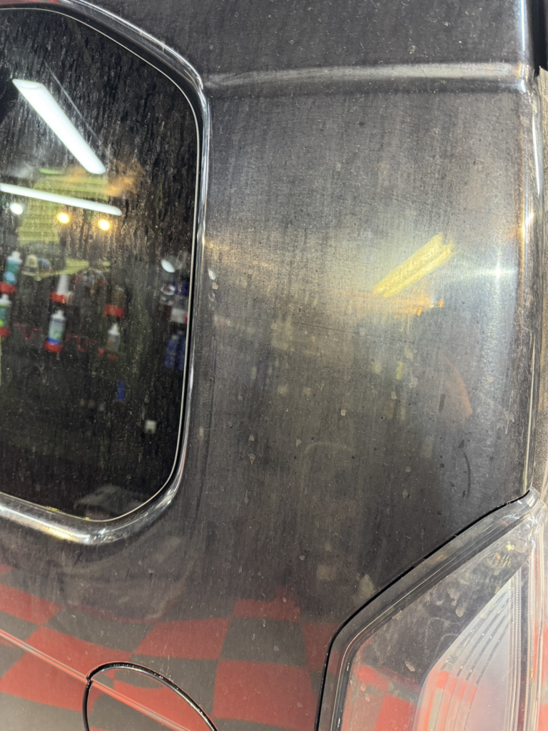 作業前に状態を確認いたします。ボディー色が黒色のお車ですが画像の通りでボディー全体が白ぼけしてしまっています。
