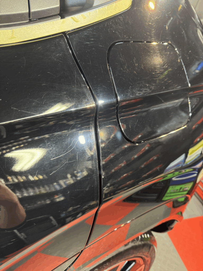 研磨を行います。研磨後は本来の艶がでて黒色のお車が引き締まります。