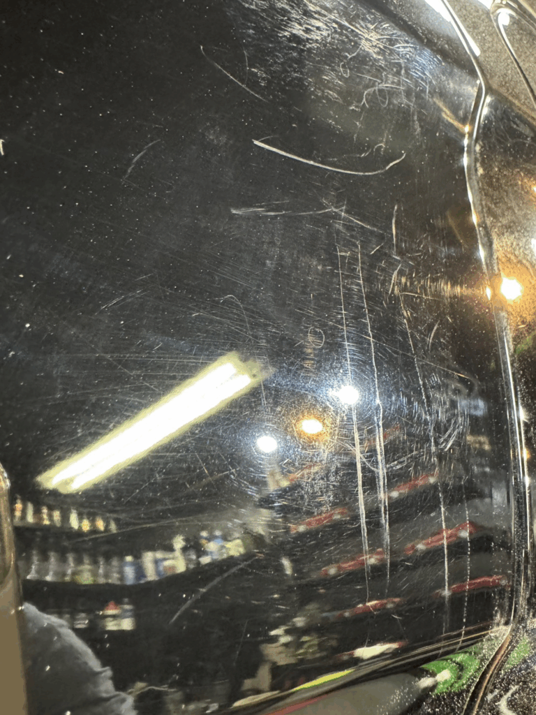 黒色のお車は傷が特に目立ちます。ボディ全体がこのような状態で深い傷も多々あります。